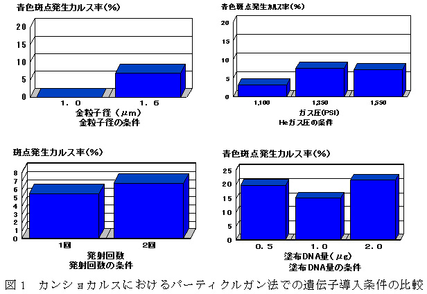 図1 カンショカルスにおけるパーティクルガン法での遺伝子導入条件の比較