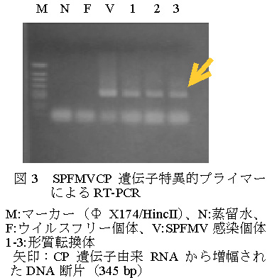 形質転換体、非形質転換体としてウイルスフリー個体及びウイルス罹病個体を用い、ISOGENによりRNAを抽出した。DNA分解酵素処理を行ったRNA抽出物からCP遺伝子特異的プライマーを用いたRT-PCRにより、形質転換体及びウイルス罹病個体からCP遺伝子由来RNAが確認された(図3)。