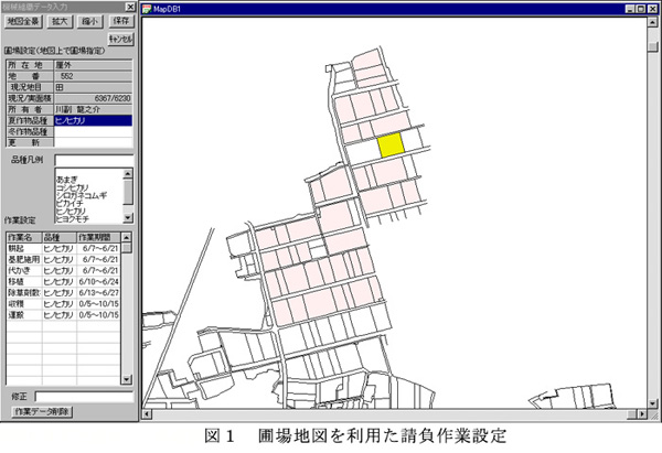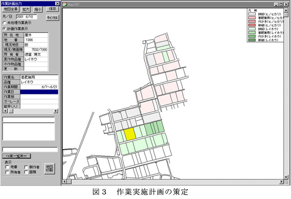 機械利用組織の運営を支援するため、地図情報を用いた年間作業計画の設定や作業シミュレートによる作業可否の判定、作業別コストの試算、作業実施計画の作成を行うシステムを作成した。