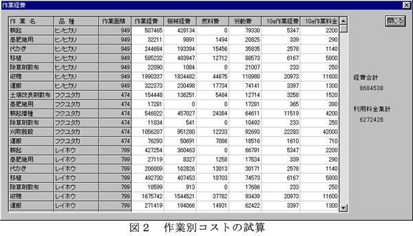 作業別のコスト試算を行うことができ、適正な作業料金設定に効果がある(図2)。