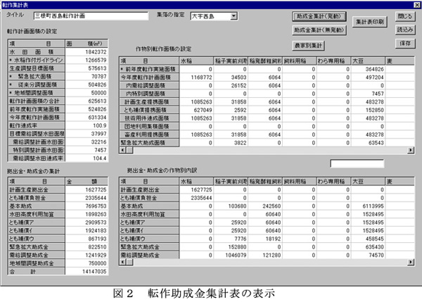 転作助成金の集計は、需給調整の発動の有無による集計が可能で、計画生産拠出金、とも補償負担金、経営確立助成(基本助成金、水田高度利用加算金)、とも補償金、緊急拡人助成金、需給調整助成金、地域間調整助成金について、全体集計および転作作物単位の集計を行い出力する(図2)。また、個人別集計の出力も可能である。