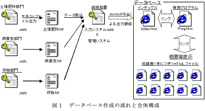 本システムでは、各部門や研究室がMicrosoftAccessで作成された入力システムに入力し、データをテキストファイルで出力して、データベースを作成・配布する提供者(試験研究機関内の統括部署)に提出する(図1)。