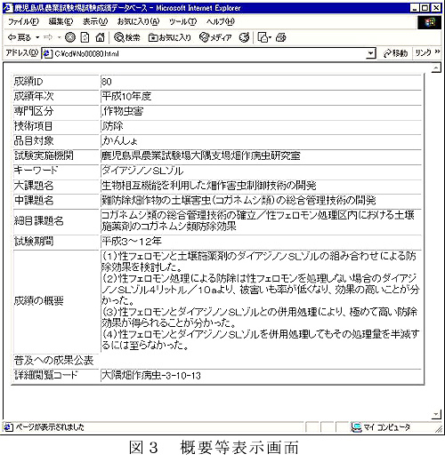 - 本システムを利用して「鹿児島県農業試験場試験成績データベース」(昭和41年以後の全ての定期発行の成績書を収録)を作成中であり、平成14年度末に県内外の試験研究機関、県内の普及・行政機関にCD-Rで配布する予定である。