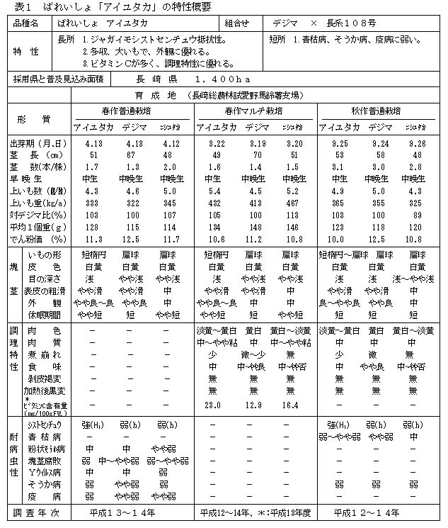 - バレイショ「アイユタカ」は、春作・秋作とも大いもで「デジマ」より収量が多く、滑皮で目が浅くて外観に優れる。ビタミンC含有量が多く、ジャガイモシストセンチュウに抵抗性を持つ、暖地二期作栽培に適した食用系統である。
