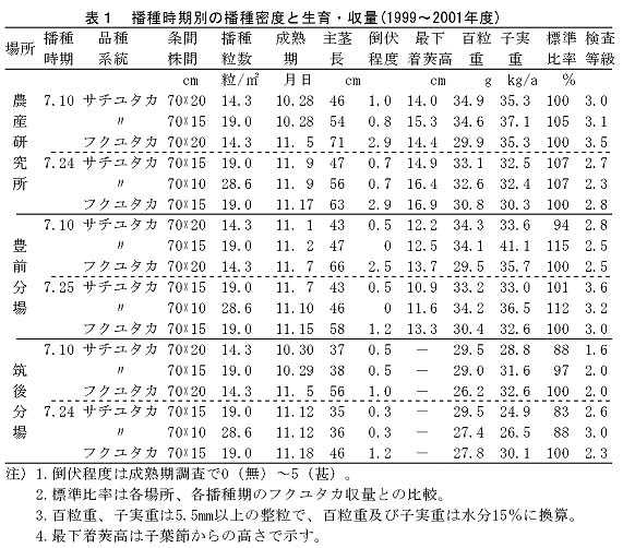 表1 播種時期別の播種密度と生育・収量(1999〜2001年度)