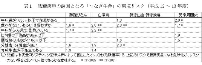 表1 肢蹄疾患の誘因となる「つなぎ牛舎」の環境リスク(平成12〜13年度)