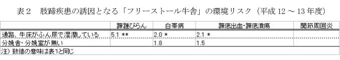表2 肢蹄疾患の誘因となる「フリーストール牛舎」の環境リスク(平成12〜13年度)