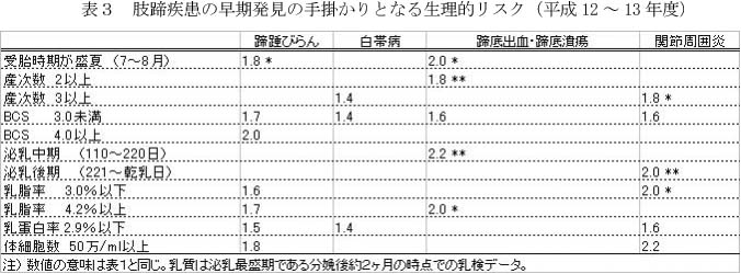 表3 肢蹄疾患の早期発見の手掛かりとなる生理的リスク(平成12〜13年度)