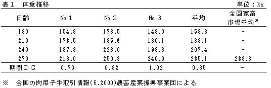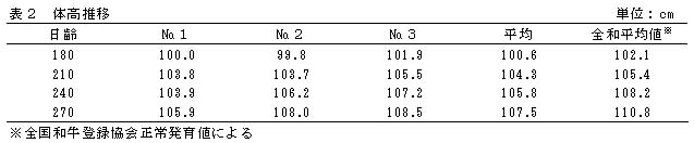 イタリアンライグラス放牧期間通算DGは平均0.85kg/日であり、体高は全和登雌数値と同等の発育が可能である(表1、表2)。