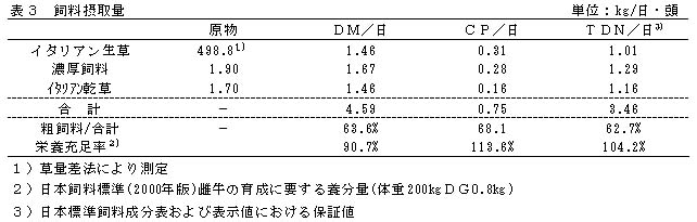 育成牛は全TDN摂取量のうち約60%をイタリアンライグラス生草および乾草から摂取し、育成に要する栄養養分量も充足するので、舎飼い時の濃厚飼料を削減できる可能性がある(表3)。