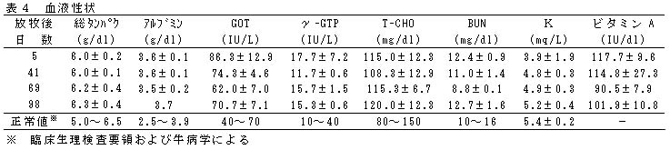 血液性状は正常値で推移し、疾病・下痢等の発生もなく、健康な肥育素牛に育成できる(表4)。
