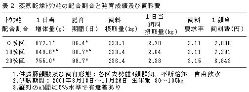 表2 蒸気乾燥トウフ粕の配合割合と発育成績及び飼料費