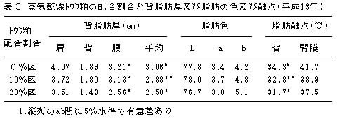 表3 蒸気乾燥トウフ粕の配合割合と背脂肪厚及び脂肪の色及び融点(平成13年)