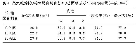 表4 蒸気乾燥トウフ粕の配合割合とロース芯面積及びロース肉の肉質(平成13年)
