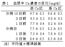 分娩前後の飼料中Ca濃度は、血漿中Ca濃度に明らかな影響を及ぼさない(表1)。