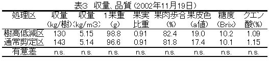 樹高低減樹の収量や品質は、通常の刈り込み剪定樹と比べると果皮色がやや濃く、クエン酸がやや低い傾向にあるが、明らかな差は認められない(表3)。