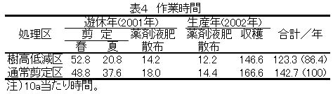 樹高低減により、剪定、薬剤散布、収穫の作業時間が短縮され、通常の刈り込み剪定のみの場合に比べ1割以上省力化できる(表4)。