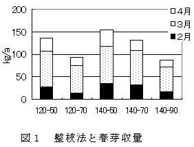 翌年の春芽収量は、50cm以上の一次側枝を除去しない方が収量が多くなるため、9月以降の株養成時は側枝数を制限しない(図1、図4)。