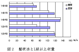 摘心位置については、120cmより140cmで摘心する方が、高単価階級であるL級以上の階級割合が高く、一次側枝数を確保できるため翌年の春芽の収量が増加する(図2)。