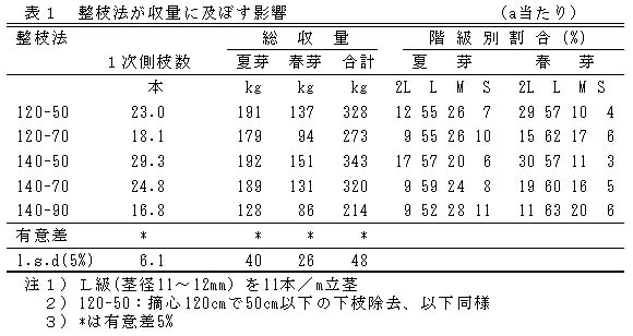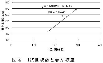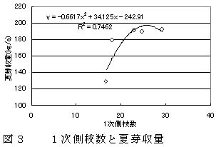 夏芽収量に有効な一次側枝数としては23本程度を確保する必要がある(表1、図3)。