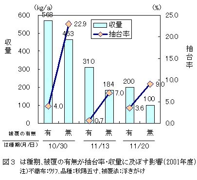 図3 は種期、被覆の有無が抽台率・収量に及ぼす影響(2001年度)
