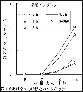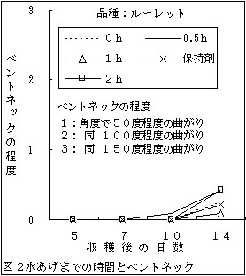 収穫後の水あげまでの時間が長いとベントネックの発生が大きく、観賞日数はベントネックが発生しやすい品種で短縮が大きいので、ベントネックや萎凋が発生しやすい品種では収穫後30分以内に水あげを行う(表1、図1、図2)。