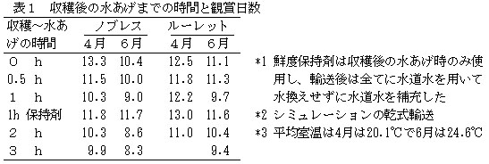 収穫後ただちの水あげに比べ、水あげまでの時間が1hでは観賞日数は9割程度に3hでは8割程度と水あげまでの時間が長くなると観賞日数は短くなるので、収穫後は1h以内に水あげを行う(表1)。