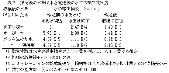 表2 採花後の水あげ水と輸送後の水中の微生物密度