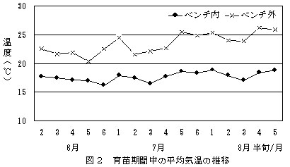 冷房育苗ベンチ内の平均温度は、外気温より摂氏5.8度低く冷却効果は十分である(図2)。