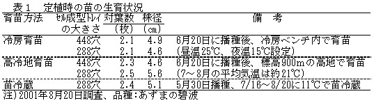 冷房育苗は高冷地育苗や苗冷蔵に比べ定植時の苗の生育は劣るが、定植には十分な苗ができる(表1)。
