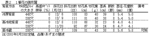 定植後、冷房育苗は高温ロゼットの発生はなく順調に生育し、1番花の切花品質は苗冷蔵とほぼ同等である(表2)。