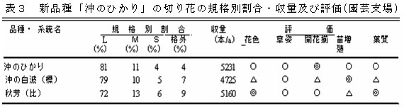 表3 新品種「沖のひかり」の切り花の規格別割合・収量及び評価(園芸支場)
