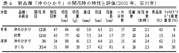 表4 新品種「沖のひかり」の開花時の特性と評価(2001年、石川市)
