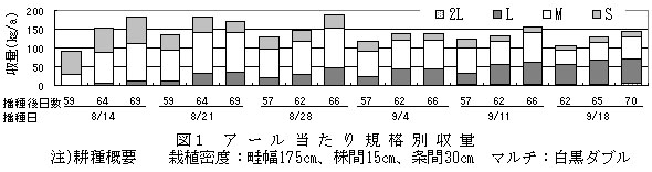一斉収穫でM〜L規格の収量が多く得られる収穫時期は、播種後62〜70日である(図1)。