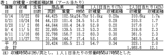 一斉収穫で得られる商品果収量は、1播種期当たり140〜190kg/a(平均165kg/a)である(表1)。