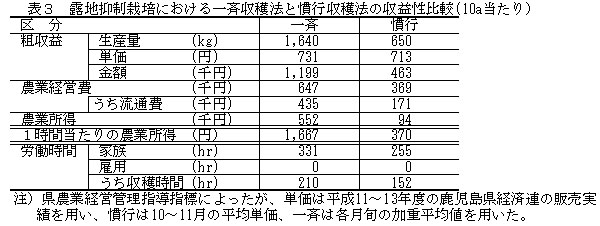 表3 露地抑制栽培における一斉収穫法と慣行収穫法の収益性比較(10a当たり)