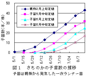 沖縄の自然条件下では、浅休眠性の促成用品種等でもランナー発生開始が遅れて発生本数が少ない。寒冷地型の深休眠性品種では、早期に苗を確保するためには低温処理による休眠打破処理が必要である(データ略)。