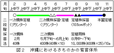 沖縄における「さちのか」苗の効率的な生産方法として、一次ランナー苗を二次親株に用いて冬期間は少ない親株数で管理できる二段階採苗法が有効である。親株を2月に定植(40株)し、5月下旬から6月上旬に発生する子苗(40株×10=400株)を採苗・定植することで、採苗適期の8月中旬には本圃定植用の子苗数(400株×25=10,000株/10a)を確保できる(図1、図2)。