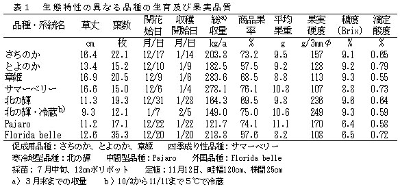 冬季短期栽培で収量を上げるためには、腋花房を連続的に分化するタイプ(章姫、サマーベリー等)、及び頂果房(+第1腋果房)で多収を上げるタイプ(Florida belle等)が有望と考えられるが、早生性と浅休眠性を有し、果実が硬く日持ち性に優れ、食味が良い促成用品種「さちのか」が最も適する(表1)。