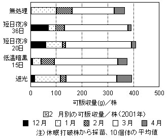 摂氏10度で15日間の低温暗黒処理を行っても効果がないばかりでなく、逆に花芽分化が遅れる(図1)。