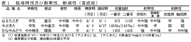 表1 栽培特性及び耐寒性、耐病性(育成地)