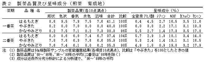 表2 製茶品質及び呈味成分(煎茶育成地)