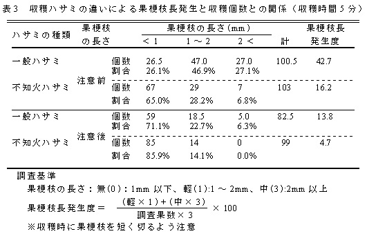 表3 収穫ハサミの違いによる果梗枝長発生と収穫個数との関係(収穫時間5分)