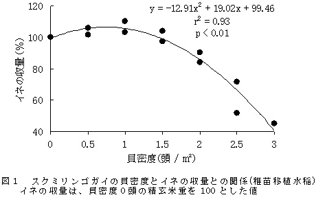 図1 スクミリンゴガイの貝密度とイネの収量との関係(稚苗移植水稲)