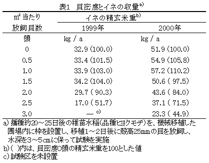 稚苗移植水稲において、殻高25mmのスクミリンゴガイが0〜1.5頭/m2では、貝の食害による収量低下はみられない(表1,図1)。