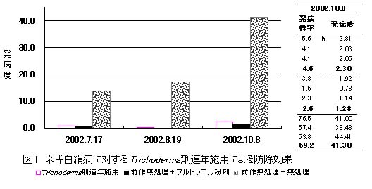 本試験に使用したTrichoderma剤は,平成15年2月現在,農薬取締法に基づく登録がされていないので,試験研究目的以外には使用できない。