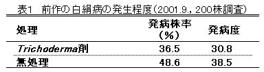 表1 前作の白絹病の発生程度(2001.9.,200株調査)