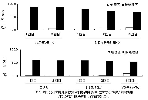 つなぎ雌の交尾率は処理区が無処理区に比べて低く、各種鱗翅目害虫において交尾阻害が認められる(図1)。