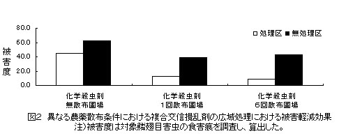 図2 異なる農薬散布条件における複合交信攪乱剤の広域処理における被害軽減効果