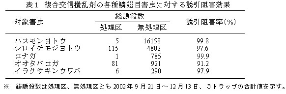 表1 複合交信攪乱剤の各種鱗翅目害虫に対する誘引阻害効果